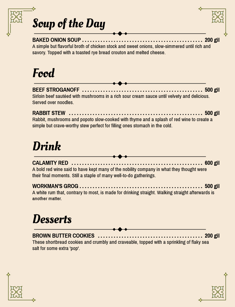 • • • • • • • • • • • • • • •WESTMOST INN & TAVERNThe tavern is on the westmost side of town not far from the general store and the church. Strolling down the hall you'll find various inn rooms, some for lone visitors, some for couples, and some that are meant to house multiple people at half the cost, provided you don't mind bunking with some strangers.• • • • • • •Potential Plot Hooks• The tavern has a high turnover for its workers. Although Margot provides excellent customer service to her guests and especially to her regulars, rumor has it she can be a real nitpicker and tends to breathe down your neck while you're working. Someone with the right placating personality and work ethic might find it worth the effort, though. There's not a thing that goes on in this settlement Margot doesn't know about. Plus, she pays better than a lot of people would be willing to, especially for an outsider.• The canvas above the fireplace was to be used for a painting by Margot's childhood friend, Lila, killed during an attack by a dragon. It's been an empty canvas for years now, and the more amiable regulars in town will quietly inform any newcomers they shouldn't ask about it. Perhaps one day she'll finally buy or commission an actual painting.• Hopefully you have a means of telling time on your person, because the longcase chronometer in the back of the room stopped working a year ago. A few have offered to take a look at it, but Margot always turns them down. Her late husband, Alphonse, built that chronometer himself, and like as not she doesn't want to risk any further damage to it. If she was ever given reason to trust someone's skill, perhaps she'd let them try. No doubt anyone who fixed it would be considered a true friend from that point on by the most in-the-know person in town.