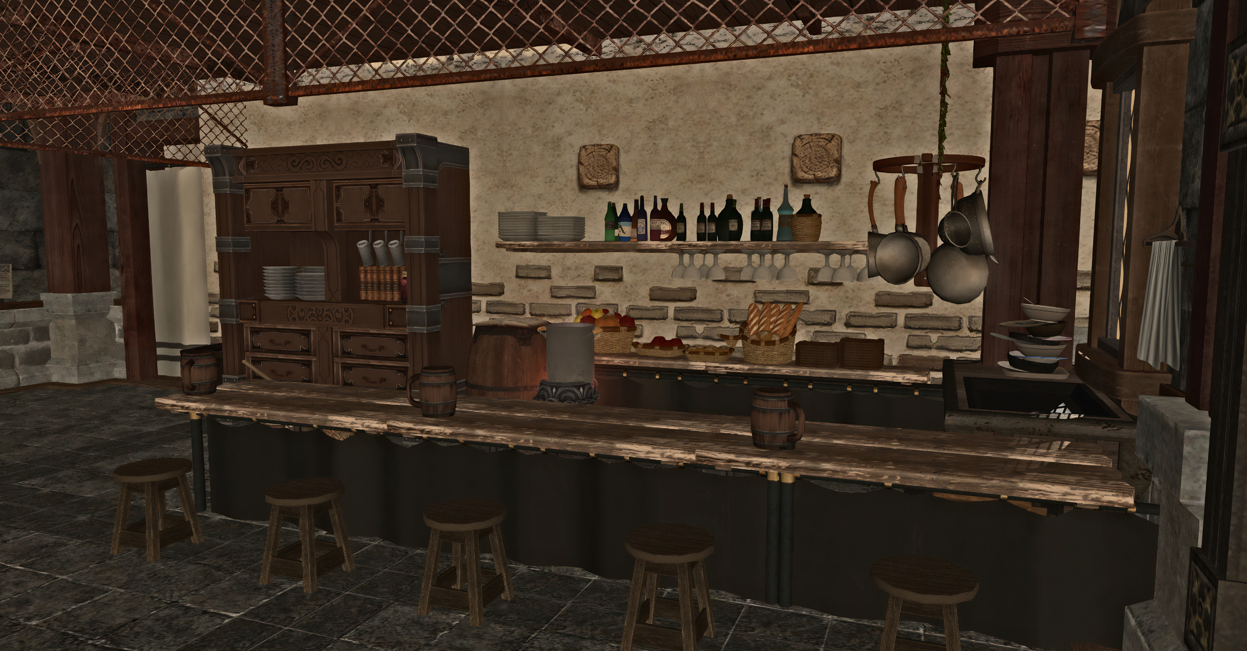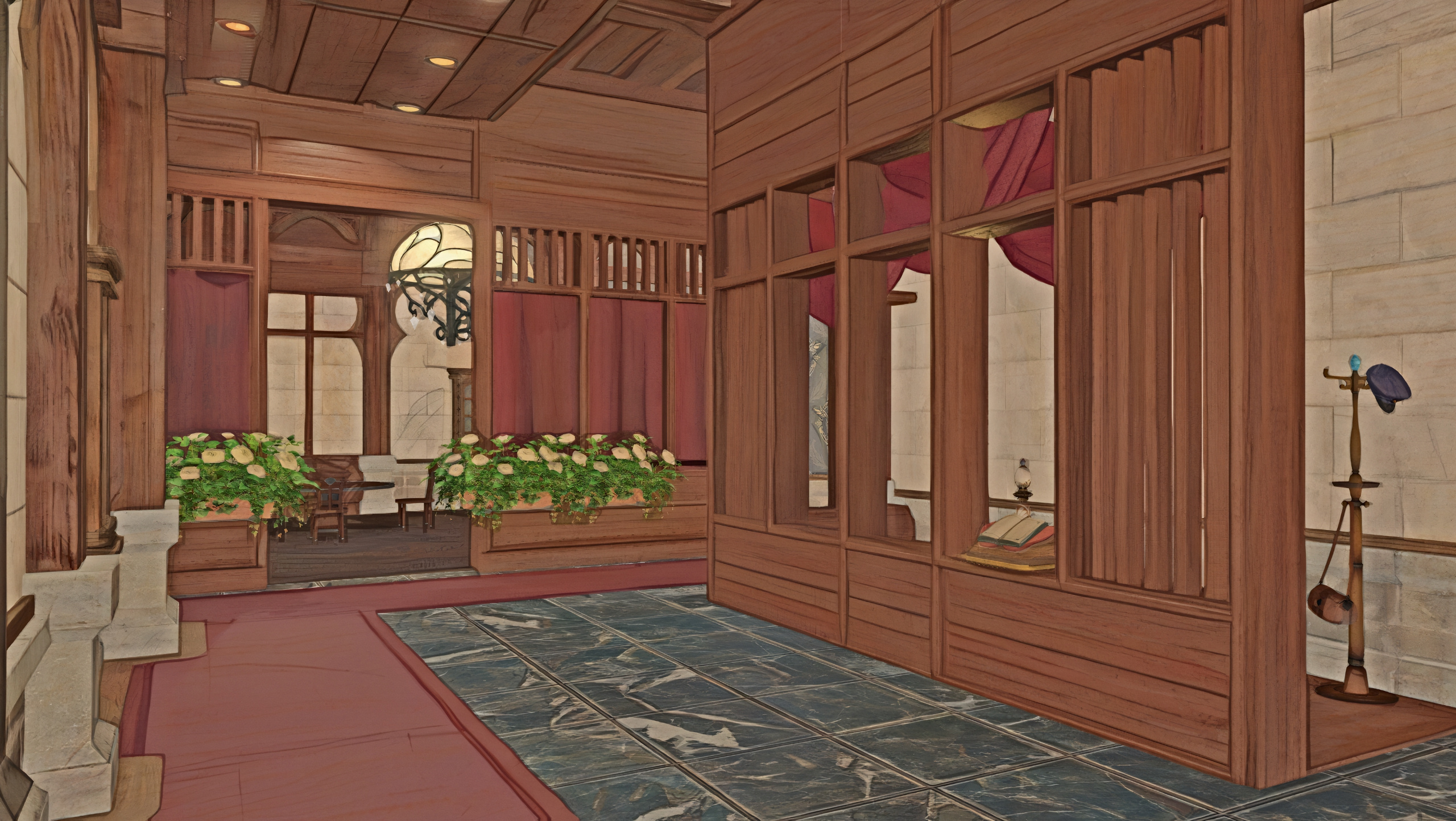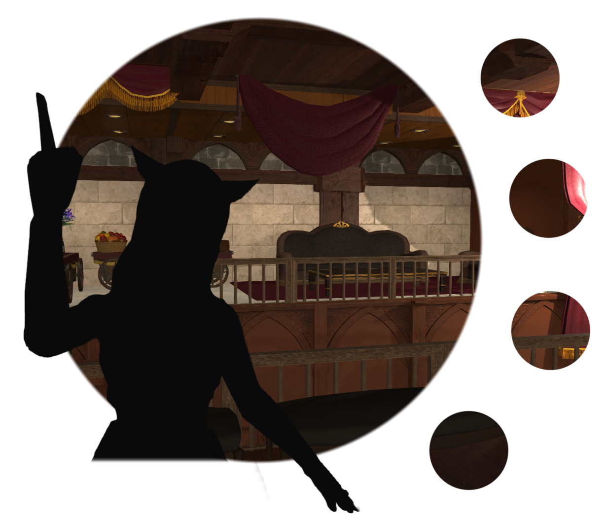 Upon entering the venue, guests will be greeted by those prepared to take temporary hold of any weapons while on the premises — unless you're due to fight in the arena, of course! — as well as answer any questions or provide directions around town.The fondness of the interior designer for the color rolanberry will likely be obvious. Those in-the-know would correctly presume this a nod towards the origin of the Mirivon family's moderate wealth, or so the story goes.