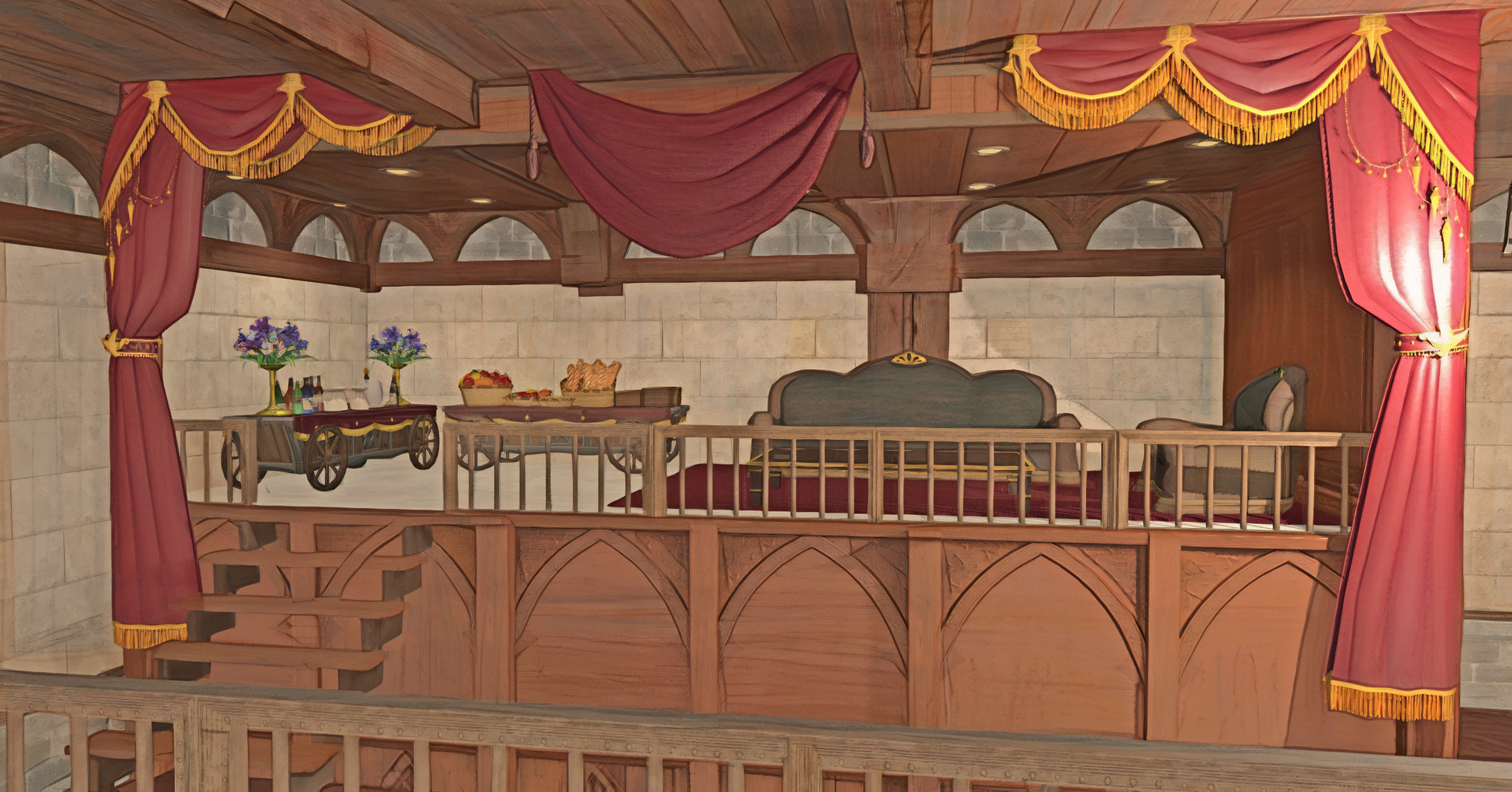 This balcony, known as the Overlook, is the roost of tournament founder Cecile Mirivon, likely a guard or two, and any esteemed guest for the evening. It's stocked with fine wine, fine food, and a quieter bit of conversation between matches.Fighters will often be invited up to discuss their fighting technique, and spectators to share a tale or two for this rapt group of listeners.